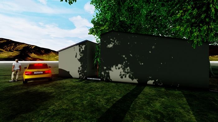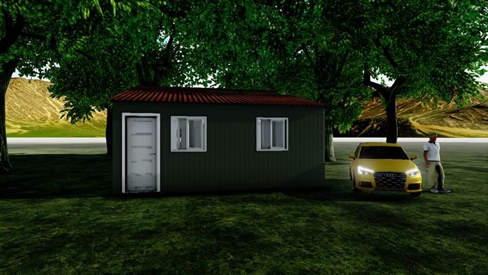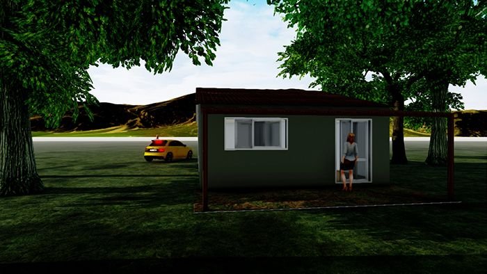 Casa prefabricada en planta baja, con distribución en dos habitaciones dobles, una con vestidor y aseo completo en suite, otro aseo común, salón con cocina americana, amplio porche y jardín semi-exterior.